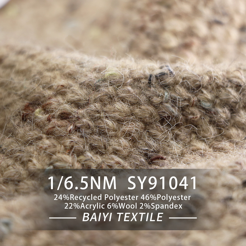Eigenschap: Goede elasticiteit, pluizig en zacht Samenstelling: 24%Recycled polyester 46%Polyester 22%Acrylic 6%Wool 2%Spandex